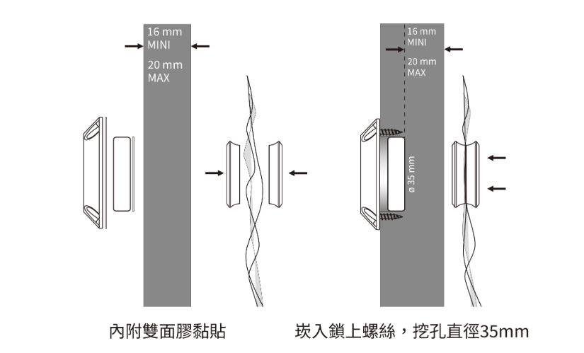 ■ 安裝方式可直接用內附雙面膠黏貼,也可崁入鎖上螺絲