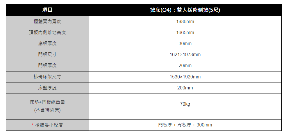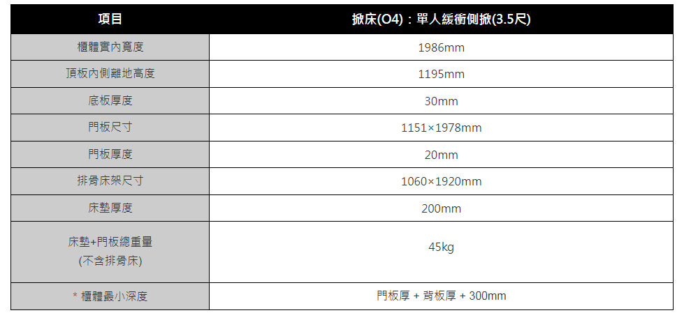 商品特色 ■ 掀床垂直收起,緩衝下翻,提高安全性 ■ 下翻時,床腳自動定位 ■ 可另購 掀床吸磁拍門器 (限床墊厚度200mm內用) 商品規格 ■ 產品包含:掀床五金×1組、床腳×1對、排骨床架×1組 / 掀床門板和櫃體的縫隙 /