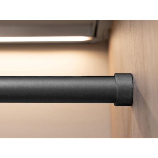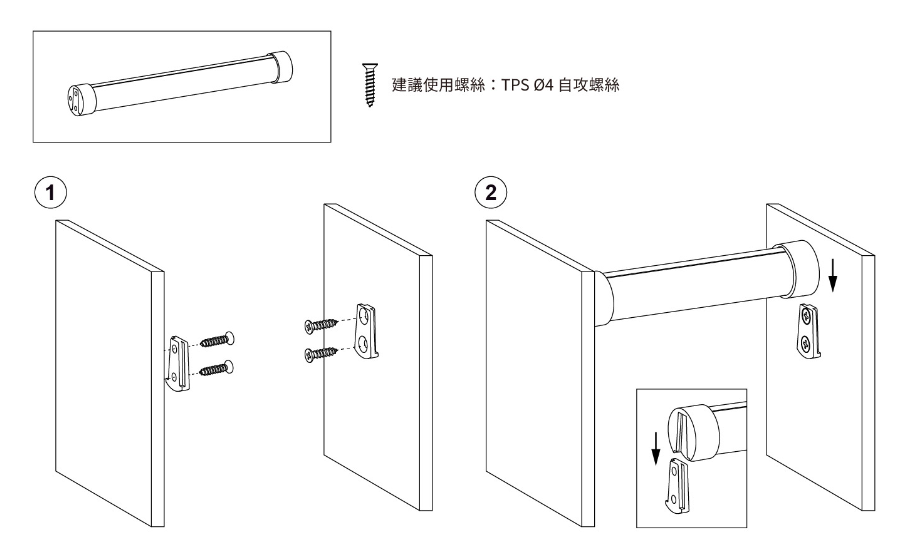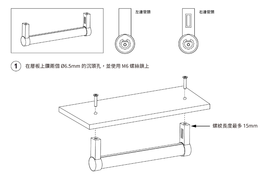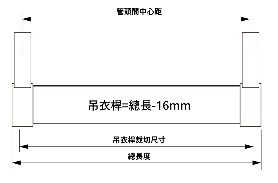 商品特色 ■ 優雅圓形吊衣桿,可安裝於層板或側板 商品規格 ■ 顏色:黑色 ■ 材質: 管-鋁合金 配件-鋅合金 / 吊衣桿裁切尺寸 / ■ 搭配目玉 ■ 搭配管頭 / 安裝示意圖 / ■ 搭配目玉 ■ 搭配管頭