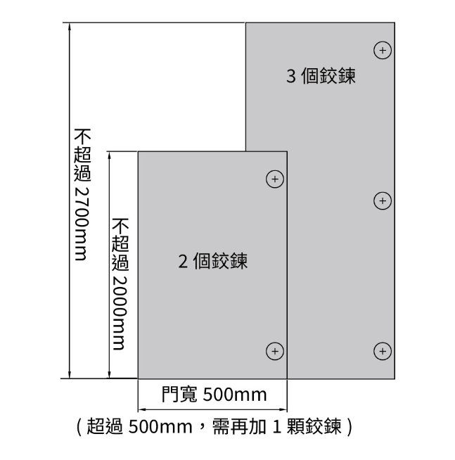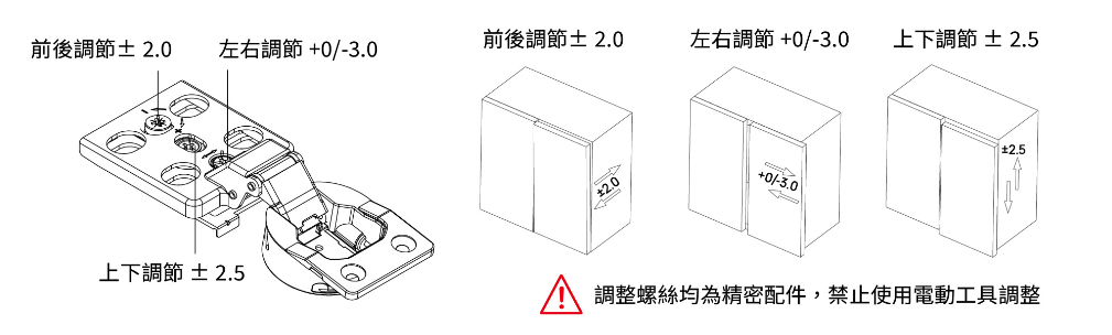 商品特色 ■ 為重型鉸鍊,穩固耐用;更薄、更隱形 ■ 單顆承重10kg,門高2700mm僅需使用3顆鉸鍊 ■ 開關滑順無阻,提升使用舒適度與質感 ■ 超快速安裝,三向調整 商品規格 ■ 適用門厚:18-28mm ■ 杯口直徑:40mm ■ 杯口深度:14.5mm ■ 開啟角度:95度 ■ 顏色:鐵灰、香檳金 ■ 分別有:6分、3分 / 五金內容物 / / 產品尺寸圖 / / 挖孔尺寸圖 / / 鉸鍊數量對照表 / / 開門所需間隙 / / 三向調整 / / 鉸鍊使用數量比較 /