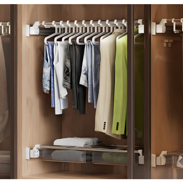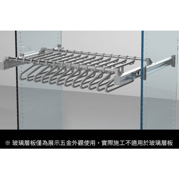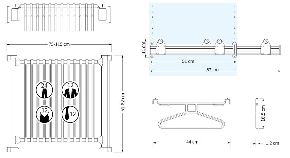 商品特色 ■ 大容量,可掛12個衣架(12件外套 – 24條褲子) ■ 環形底座,可放置領帶、皮帶和圍巾 ■ 衣架為可拆式,另可加購 ■ 可直接安裝在系統32mm排孔上 商品規格 ■ 適用櫃寬:75-115cm / 產品尺寸圖 / / 加購配件 /