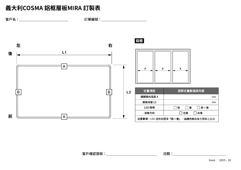 商品特色 ■ MIRA系列創新設計,四邊圓角搭配全鋁材質 ■ 側牆超薄1公分設計,符合現代感設計需求 ■ 可搭配4mm LED矽膠軟燈條 商品規格 ■ 鋁框架高:25mm ■ 適用寬度:1000mm以內可訂做 ■ 適用深度:500mm以內 ■ 適用玻璃厚度:5mm (需自備) ■ 玻璃扣法: L1-23mm L2-23mm / 訂製表 /